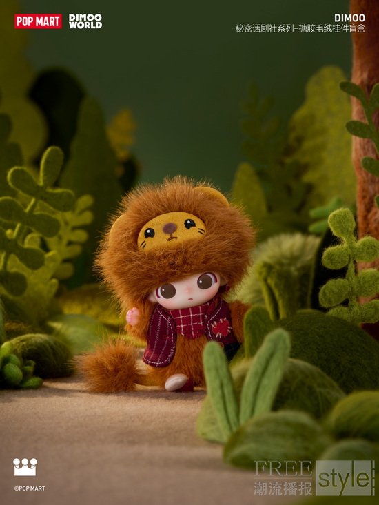 化身小狮子的DIMOO,一身长长绒毛,身后拖着蓬松的长尾巴,穿着由三种布料拼成的暗红色复古拼布小马甲,胸口绣着爱心、搭配棕色小纽扣,系着红底方格流毛边领巾,脚踩红黄拼接撞色小袜子,充满童话氛围。他像只一紧张就会炸毛的小家伙——看似威风凛凛的百兽之王,其实很胆小,但此刻为了话剧正在鼓起勇气上台。